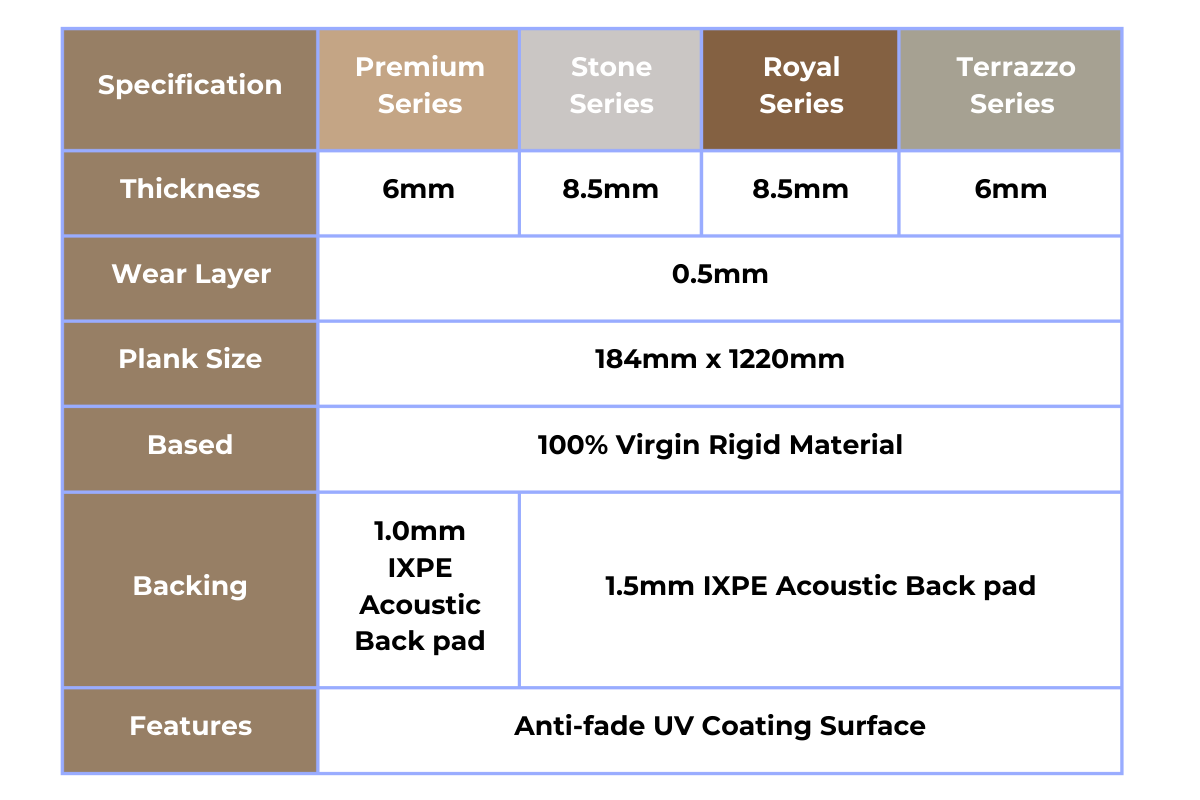 Discover the epitome of luxury with our Royal Series SPC flooring. This exquisite range features enhanced designs and colours, with an 8mm thickness and a 0.5mm wear layer. Elevate your interiors with the sophistication and resilience of the Royal Series.