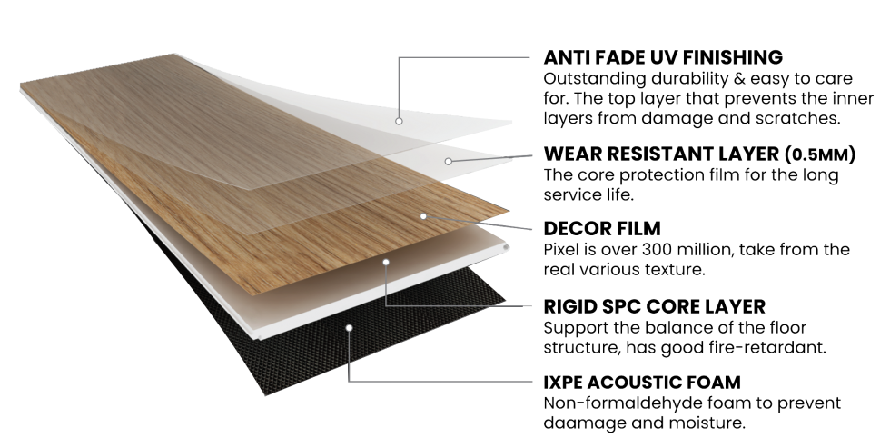 DHI SPC flooring is engineered for exceptional dimensional stability and delivers superior performance even in hot climate conditions. Designed with a high-density core, it offers outstanding waterproof capabilities and strong resistance to indentation, ensuring long-lasting durability.