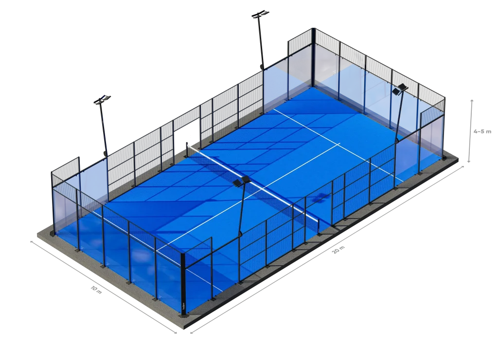Standard padel dimensions are 20m x 10m, enclosed with glass and metal fencing. Our ExcelSports x Laykold® Padel Court System is engineered for reliability, safety, and year-round performance.