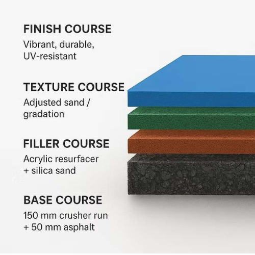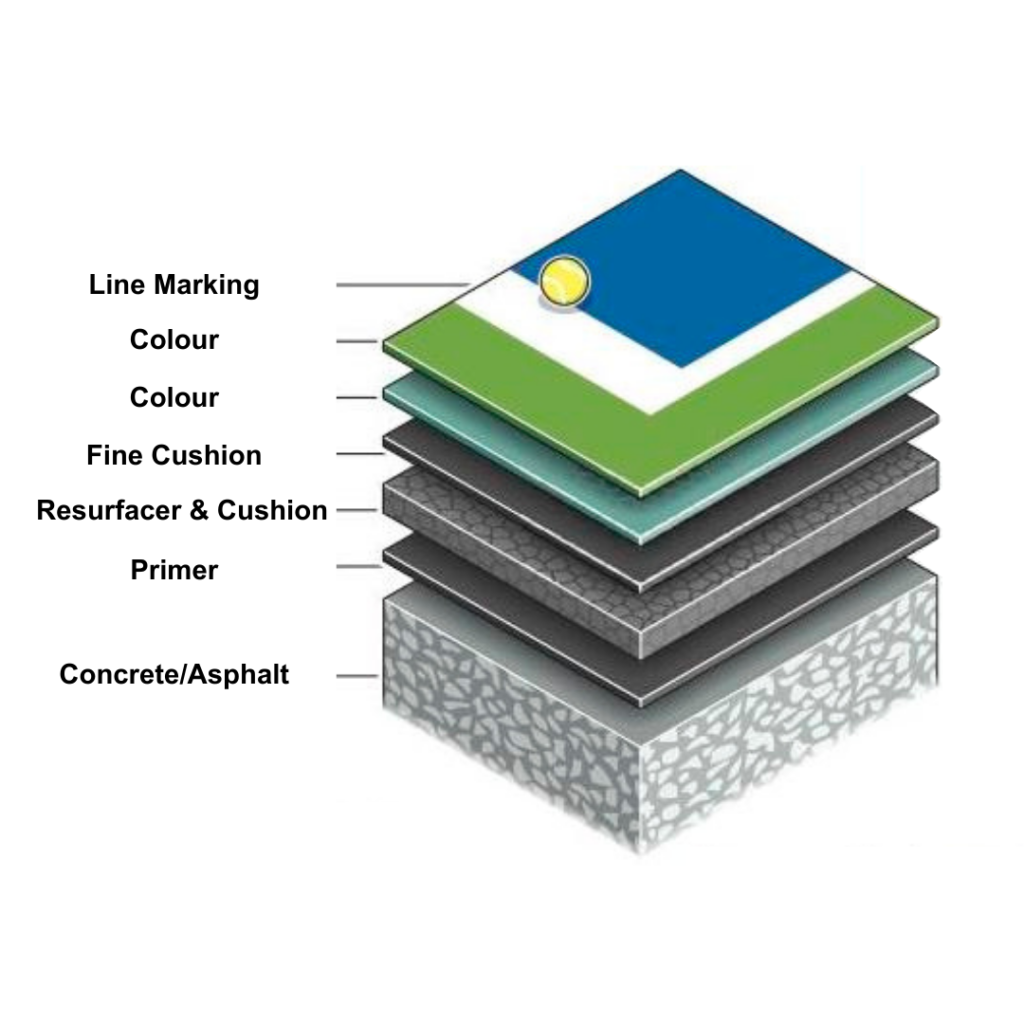 Our hardcourt is built in 4 layers, each designed for performance and protection.